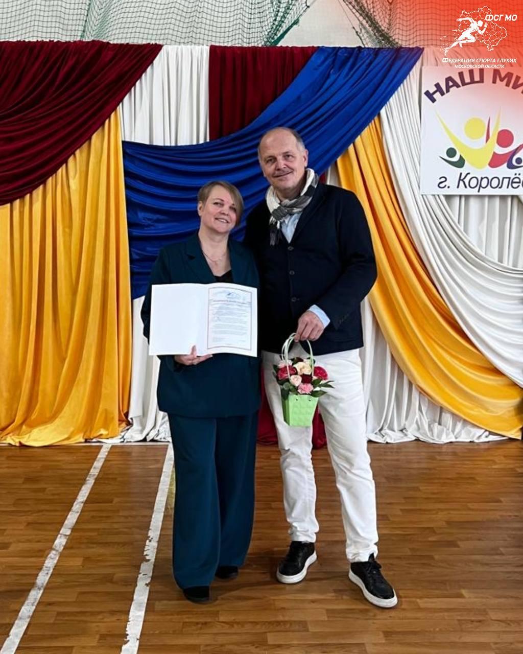 👤В рамках торжественного мероприятия, посвященного этому торжеству, член правления Федерации спорта глухих Московской области Дмитрий Иванов поздравил директора спортшколы Юлию Ухареву.